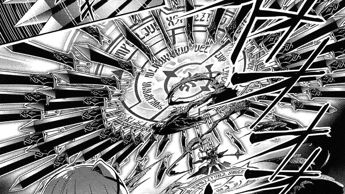 Doom Bringer (ドゥームブリンガー Dūmu Buringā) is a shooting attack of sword-shaped projectiles possessed by Lord Dearche in the portable continuity. It is in substance a copy of Hayate Yagami's Balmung.