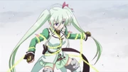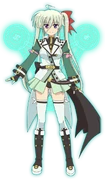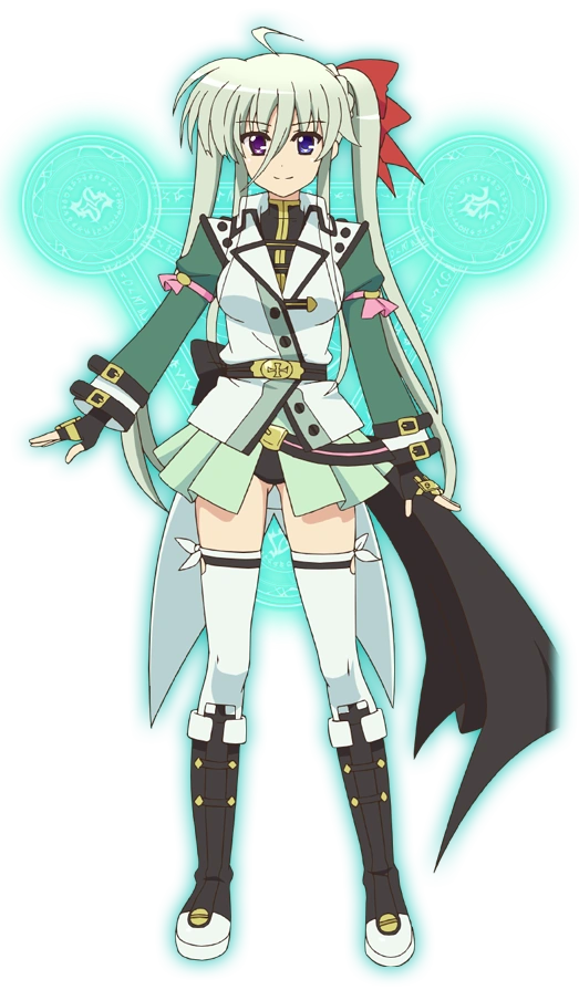 She refers to herself in Barrier Jacket as Armed Form (武装形態 Busō Keitai),[7] similar to other practitioners of Ancient Belkan martial arts. Her Jacket consists of a light-green mini dress covered by a white jacket, long white socks, and black boots. There are also long, puffy sleeves on her dress, gloves around her hands, and a choker on her neck. Notably, her hairstyle and hair band/ribbon are changed by Asteion after receiving it.