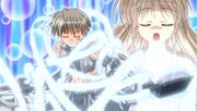 At this moment, Thoma wakes up, still delirious from fever, and throws up. Lily, the only one left at his side, frantically tries to reach him, Isis, or Steed with her telepathy but fails. At this moment, they are found by Cypha of Hückebein, who tells Lily that Thoma is becoming "just what an Eclipse Driver should be" and that Lily would soon "become one" with him. Lily doesn't understand what she means and Cypha concludes that she has been damaged and should be destroyed before Hückebein claims Thoma. They are saved, however, by the timely arrival of Signum and Agito. Thoma remains passive throughout the most of their battle and only regains full consciousness when Isis returns and tries to carry him to a safer location. When he does, however, he pushes her away and lets out a scream of pain. Cypha comments that since he has awoken, he must be one of them now and she will take him with her.