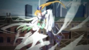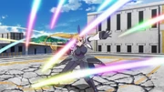 In episode 1, Vivio knocks down Fuka Reventon in their spar. In a subsequent re-match, she attacks Fuka with Accel Smash W, but before Fuka is judged as K.O., she is also ringed out and down after assuming Fuka's Hegemon Sky-severing Knuckle.